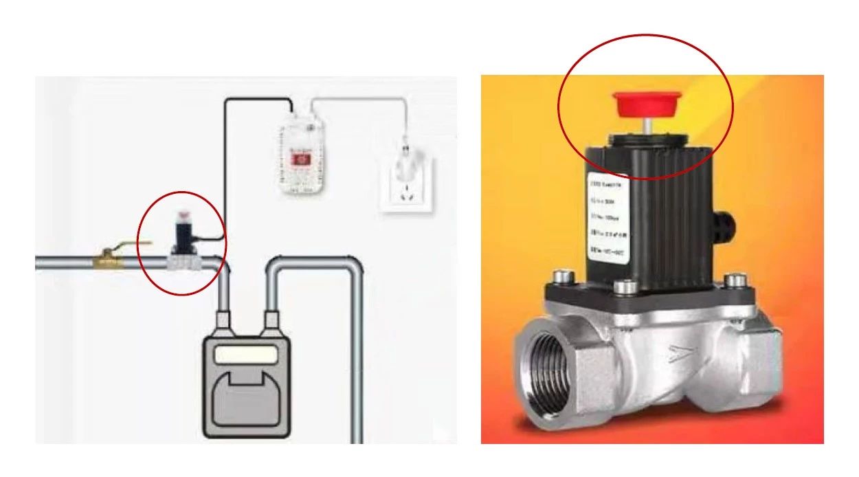 4、如果用戶家裡裝了報警器和聯動的電磁閥(又叫緊急切斷閥),請您檢查電磁閥的紅鈕是否關閉,如關閉,請提🔱起(見✨下圖);
