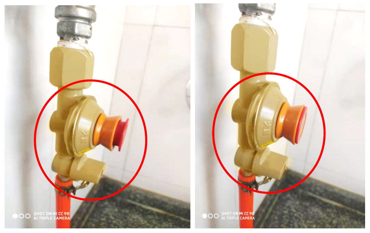 2、如果紅色提帽沒有吸回(下圖右),說明軟管、竈具不漏氣,用🙇♀️戶可以放心使用。
