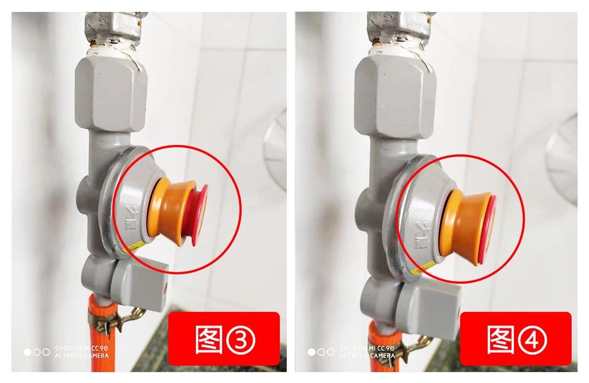 (1)關閉竈具,拉起紅色提鈕到頂點(見圖①)。注意小閥門手柄應打開(橫着為關,順着為開)。
